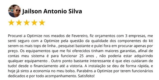 A Optimize Soluções em Engenharia e uma empresa que atua no mercado solar desde 2015 e possui em seu rol de mais de 500 usinas instaladas. O que comprova a credibilidade que possuímos para que seu projeto de energia solar aconteça sem dores de cabeça ou surpresas desagradáveis. Também somos membros associados do Movimento Solar Livre, contribuindo com o desenvolvimento da energia solar em nosso país.